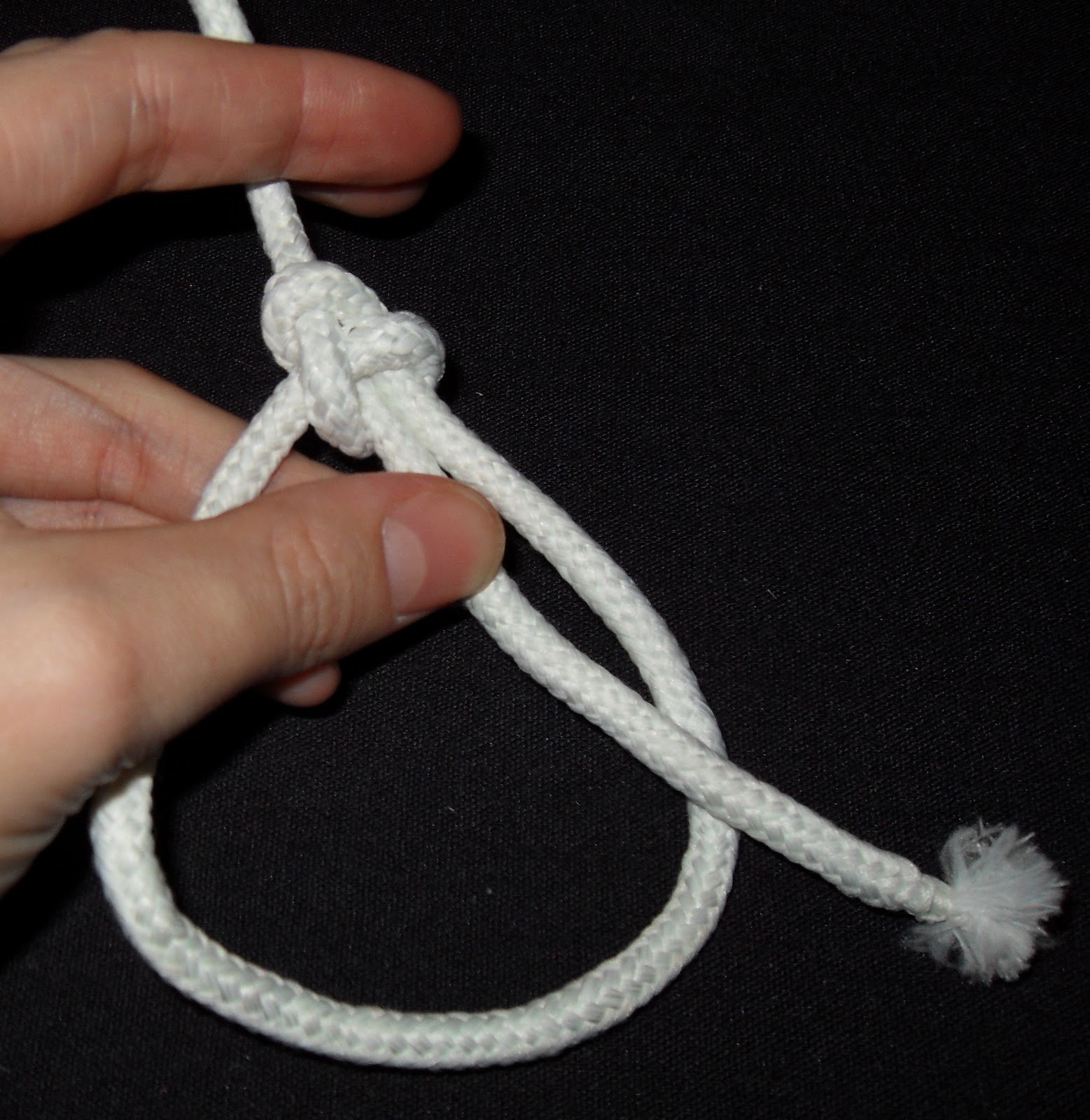 | Pull everything tight. If it's done right, you should be able to yank on the rope as much as you want, and the rope won't tighten around the wrist! |